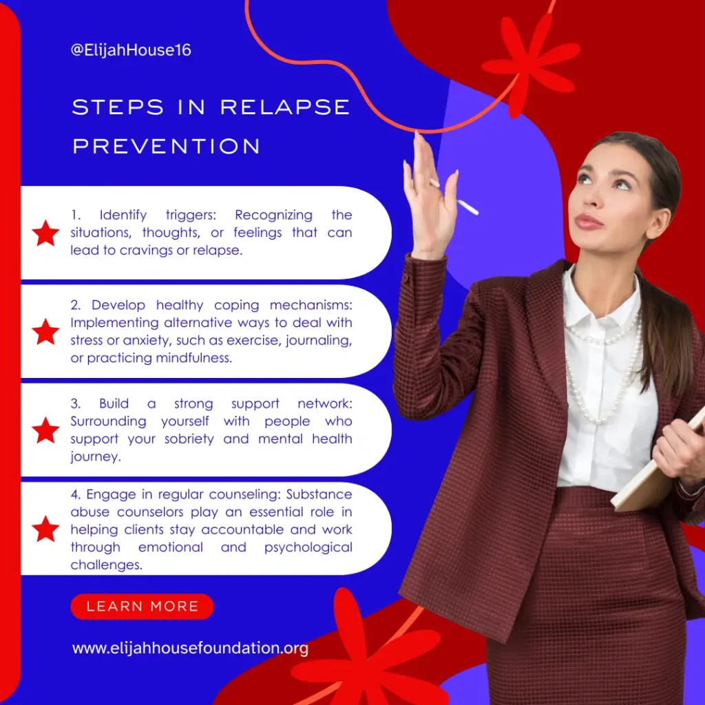 Relapse prevention is critical to sustaining long-term sobriety, especially for individuals who struggle with anxiety disorders. Some steps in relapse prevention include: